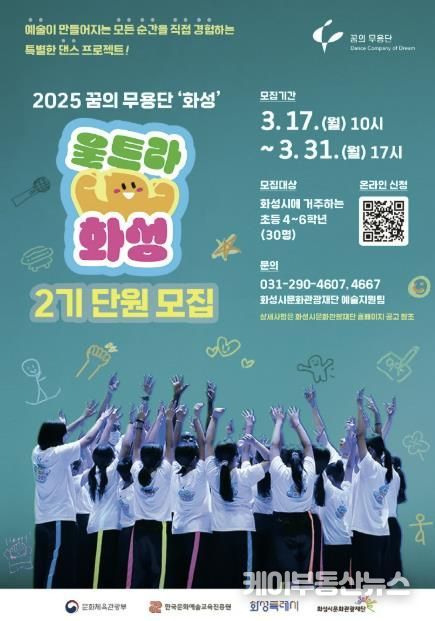케이부동산뉴스 김교민 기자 | (재)화성시문화관광재단은 꿈의 무용단 ‘화성’2기 단원을 3월 17일부터 31일까지 모집한다.