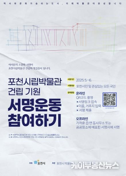 케이부동산뉴스 김교민 기자 | 포천시는 오는 6월 말까지 시민과 함께하는 ‘포천시립박물관 건립 기원 시민 서명운동’을 개최한다.