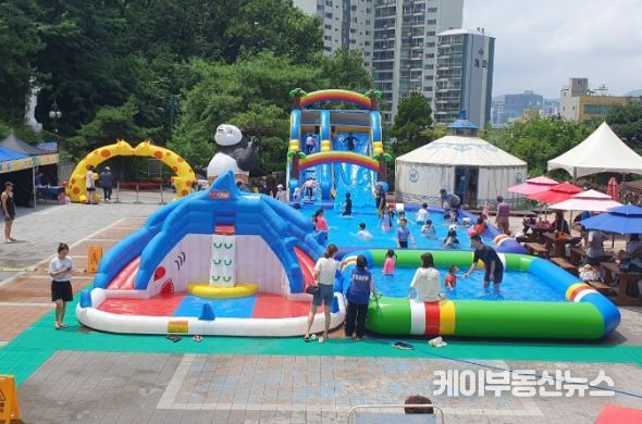 7월 25, 26일 이틀간 운영하는 ‘찾아가는 아동 물놀이장’에는 아동들이 안전하게 뛰어놀 수 있는 에어바운스형 슬라이드와 대형풀장을 설치해 체험형 물놀이장을 마련했다.