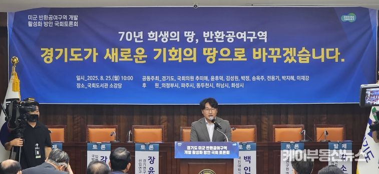 케이부동산뉴스 김교민 기자 | 경기도의회 기획재정위원회 조성환 위원장(더불어민주당, 파주2)은 8월 25일 국회도서관 소강당에서 열린 '미군 반환공여구역 개발 활성화 방안 국회토론회'에 참석해 “분단의 아픔 속에서 탄생했던 미군 공여지가 주민들을 위해 반환될 때, 경기도민은 물론 국민 모두가 만족할 수 있을 것”이라고 강조했다.