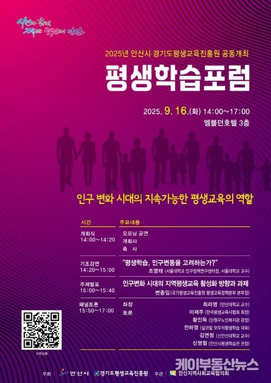 케이부동산뉴스 김교민 기자 | 경기도평생교육진흥원은 16일 안산 엠블던호텔에서 안산시와 공동으로 ‘인구 변화 시대의 지속가능한 평생교육의 역할’을 주제로 평생학습포럼을 열었다.