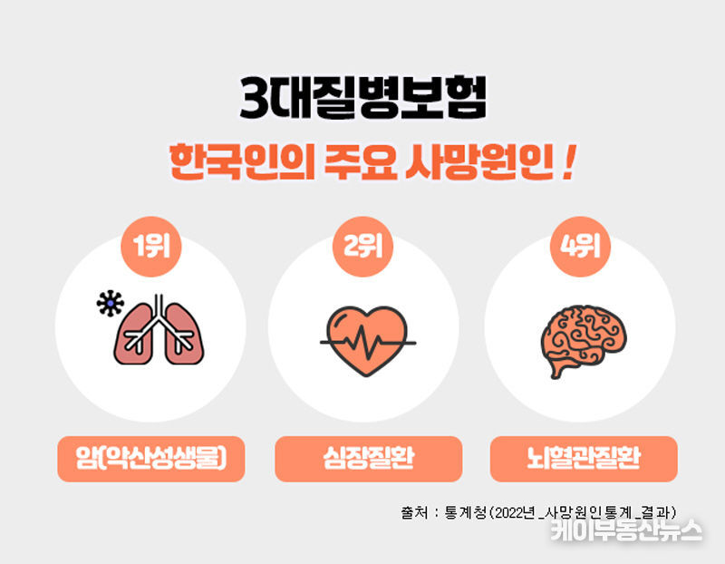 케이부동산뉴스 김교민 기자 | 3대질병으로 일컬어지는 암, 뇌혈관질환, 심혈관질환은 한국인의 주요 사망원인에서 상위를 차지하고 있으며, 이에 대한 진단비를 집중적으로 보장해 주는 보험상품을 3대질병진단비 보험이라 할 수 있다.