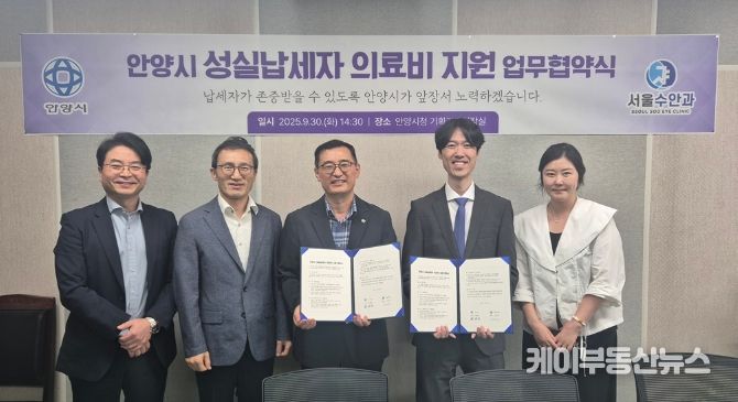 케이부동산뉴스 김교민 기자 | 안양시는 지난달 30일 오후 2시30분 3층 기획경제실장실에서 관내 의원인 서울수안과와 ‘성실납세자 의료비 지원’ 업무협약을 체결했다고 1일 밝혔다.