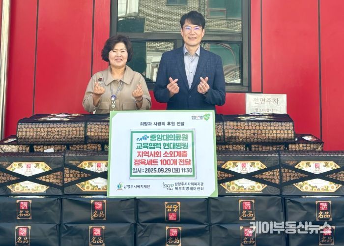 케이부동산뉴스 김교민 기자 | 남양주시는 지난달 29일 진접읍에 위치한 중앙대의료원 교육협력 현대병원이 추석을 앞두고 1,000만 원 상당의 정육세트 100개를 북부희망케어센터에 전달했다고 2일 밝혔다.