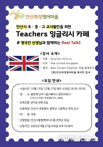 케이부동산뉴스 김교민 기자 | 안산시 안산화정영어마을은 오는 15일부터 12월 17일까지 관내 소속 교사를 대상으로 ‘티처스(Teachers) 잉글리시 카페’를 운영한다고 10일 밝혔다.