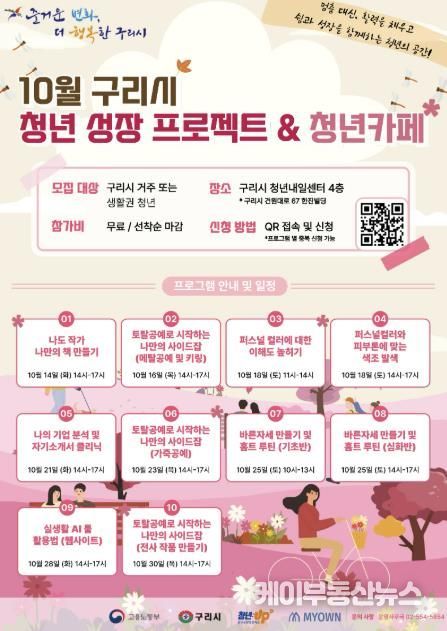 케이부동산뉴스 김교민 기자 | 구리시는 고용노동부 공모사업에 선정돼 4월부터 추진 중인‘2025년 구리시 청년 성장프로젝트’의 10월 프로그램 참여자를 10월 30일 오후 1시까지 모집한다고 밝혔다.