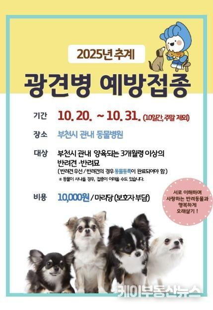 케이부동산뉴스 김교민 기자 | 부천시는 10월 20일부터 31일까지 토요일과 일요일을 제외한 평일에 관내 동물병원 71곳에서 ‘추계 광견병 예방접종’을 실시한다.