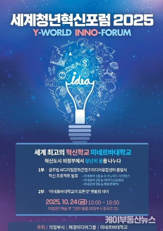 케이부동산뉴스 김교민 기자 | 의정부시는 10월 24일 오전 10시, 아일랜드캐슬 2층 그랜드볼룸에서 ‘세계청년혁신포럼 2025(Y-WORLD INNO-FORUM)’를 개최한다.