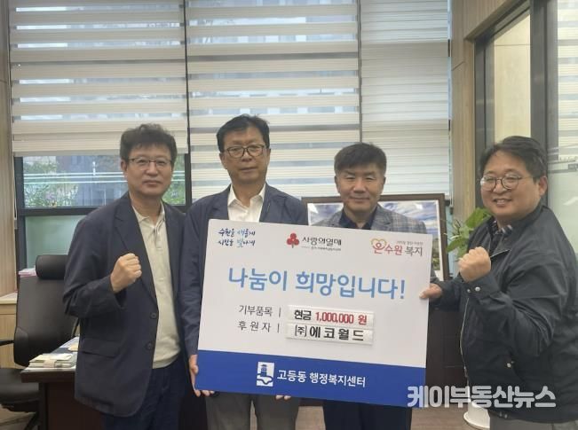 케이부동산뉴스 김교민 기자 | 수원시 팔달구 고등동은 10월 13일, 사회적기업 ㈜에코월드로부터 관내 취약계층을 위한 이웃돕기 성금 100만원을 전달받았다고 밝혔다.