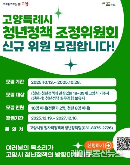 시 관계자는 “청년의 시각과 목소리가 고양시 정책에 반영될 수 있도록 청년정책조정위원회의 역할이 점점 중요해지고 있다”며, “열정과 책임감을 가진 청년과 전문가들의 많은 관심과 참여를 기대한다”고 말했다.