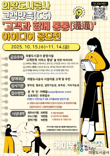 케이부동산뉴스 김교민 기자 | 의왕도시공사는 고객만족(CS) 아이디어 공모전‘고객과 함께 통통(通通)’을 추진한다고 밝혔다.