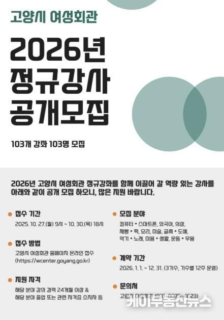 케이부동산뉴스 김교민 기자 | 고양특례시 여성회관에서 2026년 정규강좌 운영을 위한 정규강사진을 공개 모집한다.