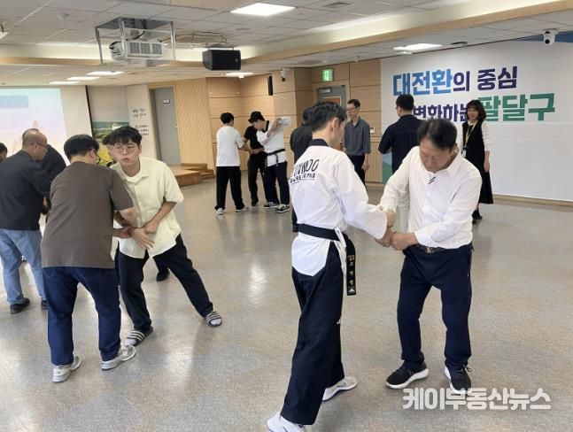 케이부동산뉴스 김교민 기자 | 수원시 팔달구는 공공청사 내 각종 폭력 및 테러에 대응하기 위해 지난 17일 SOS팔달안전봉사단과 구·동 공직자를 대상으로 구청 대회의실에서 호신술 실습 등 범죄예방 교육을 실시했다.