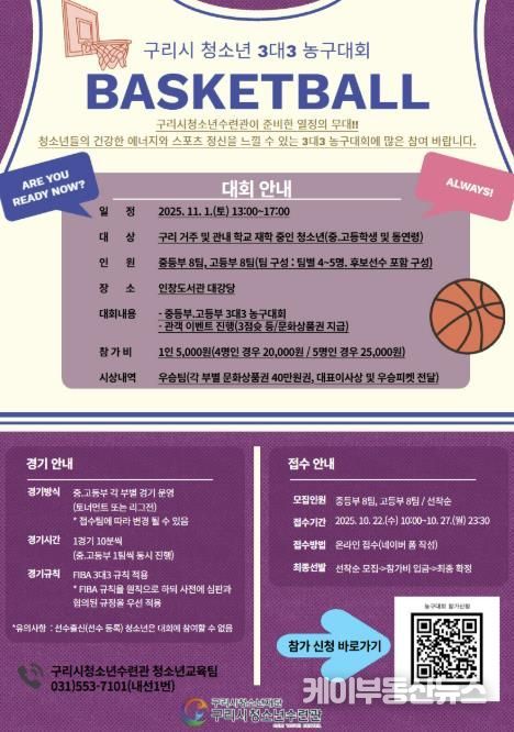 케이부동산뉴스 김교민 기자 | 구리시청소년재단 청소년수련관은 '2025 구리시 청소년 3대3 농구대회' 참가 신청을 10월 22일부터 10월 27일까지 온라인으로 신청받는다고 밝혔다.