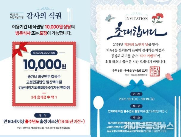 이문주 마두1동 새마을부녀회장은“노인의 날을 맞아 지역 어르신들께 감사의 뜻을 전하고자 이번 행사를 마련했다”며 “가가호호 방문해 식사권을 전달하고 어르신들의 안부를 확인해 주신 통장님들에게 감사의 말씀을 전한다”고 말했다.