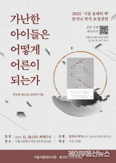 케이부동산뉴스 김교민 기자 | 시흥시 중앙도서관은 ‘2025년 시흥 올해의 책’으로 선정된 '가난한 아이들은 어떻게 어른이 되는가'의 저자 강지나 작가를 초청해 11월 19일 오후 7시 중앙도서관 3층 다목적실에서 시민 강연회를 개최한다.