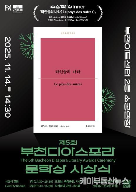 케이부동산뉴스 김교민 기자 | 부천시는 11월 14일 부천아트센터에서 열리는 ‘2025년 제5회 부천디아스포라문학상’ 시상식을 앞두고, 수상작으로 레일라 슬리마니 작가의 ‘타인들의 나라(Le pays des autres)’를 선정했다고 22일 밝혔다.