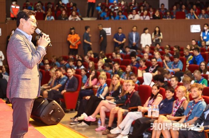 케이부동산뉴스 김교민 기자 | 이상일 용인특례시장이 10일 용인에 머물고 있는 ‘제25회 세계스카우트잼버리’ 참가 대원들을 위해 시가 마련한 공연장을 찾아 용인특례시를 영어로 소개하며 환영의 뜻을 밝혔다.