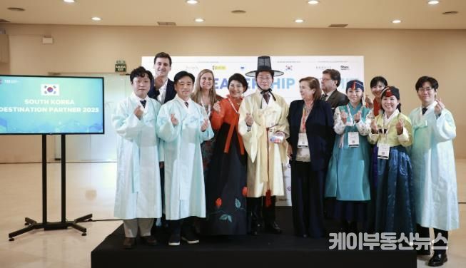 케이부동산뉴스 김교민 기자 | 스페인을 방문한 용인특례시 대표단이 세비야에서 열린 '관광혁신 서밋(Tourism Innovation Summit) 2025'에서 한복 차림으로 행사에 참여하고 갓과 '호작도' 등을 선물해 스페인 현지의 큰 관심을 끌었다.
