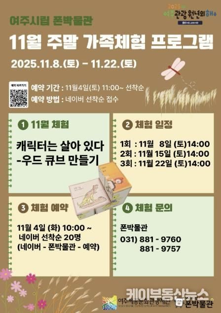 케이부동산뉴스 김교민 기자 | 여주세종문화관광재단은 여주시립 폰박물관에서 2025년 11월 8일부터 11월 22일까지 매주 토요일 오후 2시, 온 가족이 함께 즐길 수 있는 ‘11월 주말 가족 체험 프로그램’을 운영한다고 밝혔다.
