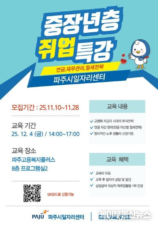 케이부동산뉴스 김교민 기자 | 파주시는 오는 11월 10일부터 28일까지 ‘중장년층 취업 특강’에 참여할 교육생 15명을 선착순으로 모집한다.