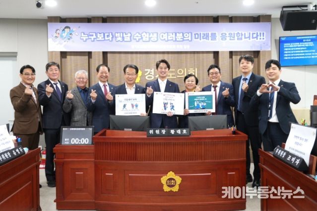 케이부동산뉴스 김교민 기자 | 경기도의회 문화체육관광위원회(위원장 황대호)는 오늘 전국 약 55만 명의 수험생이 2025학년도 대학수학능력시험에 임하는 날을 맞아, ‘누구보다 빛날 수험생 여러분의 미래를 응원합니다!’라는 메시지를 전하며 모든 수험생들에게 따뜻한 격려와 힘찬 응원을 보냈다.