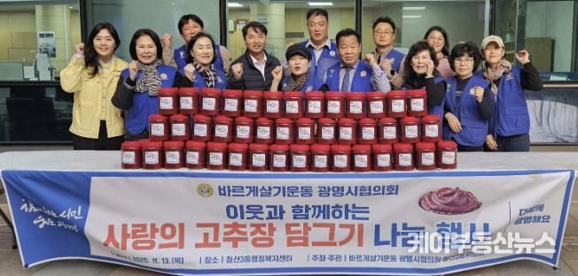 케이부동산뉴스 김교민 기자 | 광명시 철산3동 바르게살기위원회는 지난 13일 철산3동 행정복지센터 앞마당에서 ‘사랑의 고추장 나눔 행사’를 개최했다.