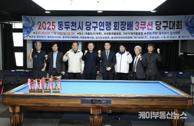 케이부동산뉴스 김교민 기자 | 동두천시당구연맹이 주최·주관하고 동두천시와 동두천시의회가 후원한 ‘2025 동두천시당구연맹 협회장배 3쿠션 당구대회’가 지난 11월 16일 동두천 캐롬토크클럽 당구장에서 성황리에 열렸다.