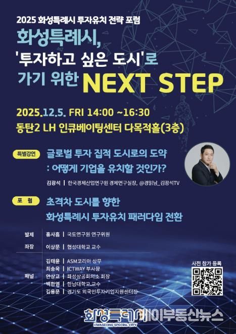 케이부동산뉴스 김교민 기자 | 화성특례시가 ‘2025 화성특례시 투자유치 전략 포럼’을 다음 달 5일 동탄2 인큐베이팅센터 다목적홀에서 개최한다.