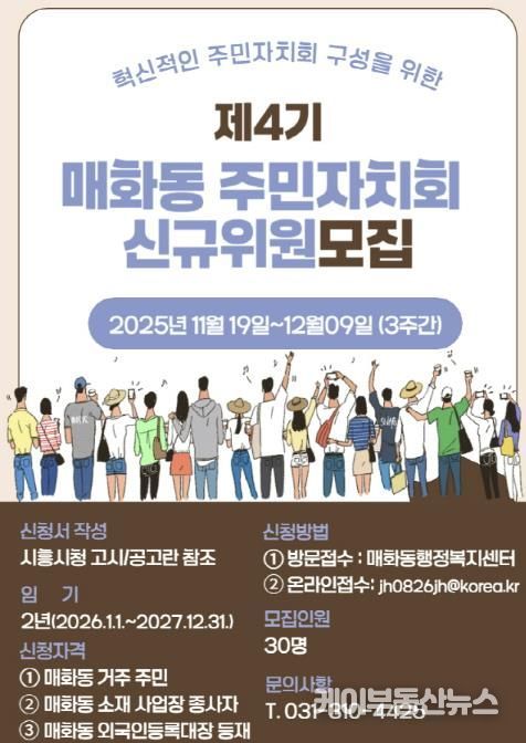 케이부동산뉴스 김교민 기자 | 시흥시 매화동 행정복지센터는 12월 9일까지 ‘제4기 매화동 주민자치회’ 신규위원 30명을 공개 모집한다. 신청은 매화동 행정복지센터 방문 또는 전자우편을 통해 가능하다.