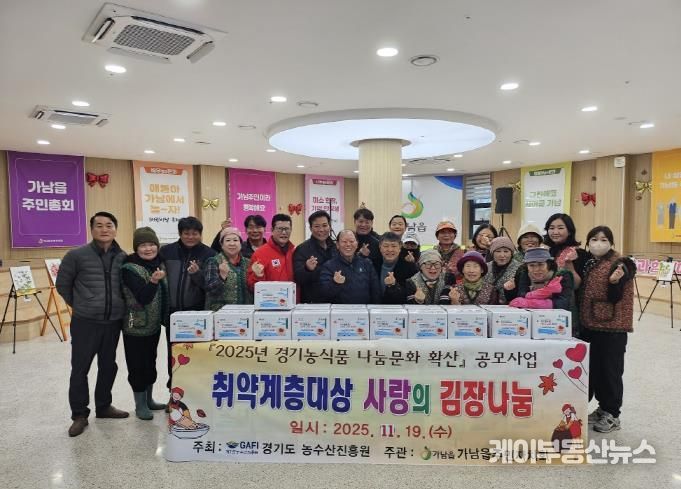 케이부동산뉴스 김교민 기자 | 가남읍주민자치회는 11월 18일에서 19일 이틀간 가남읍 행복나눔센터 1층에서 ‘취약계층대상 사랑의 김장나눔’봉사를 개최했다. 이번 행사는 '2025년 경기농식품 나눔문화 확산' 공모사업의 일환으로 진행됐으며, 정성스럽게 담근 김장김치와 알타리김치를 관내 40개 마을의 홀몸어르신 80명에게 전달했다.