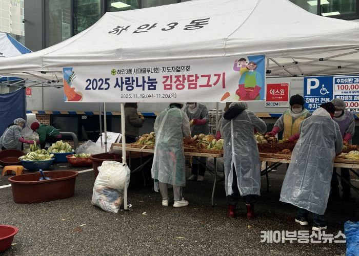 케이부동산뉴스 김교민 기자 | 광명시 하안3동 새마을부녀회와 새마을지도자협의회는 지난 19일부터 20일까지 이틀간 하안3동 행정복지센터 앞 주차장에서 ‘사랑나눔 김장 담그기’ 행사를 열었다.