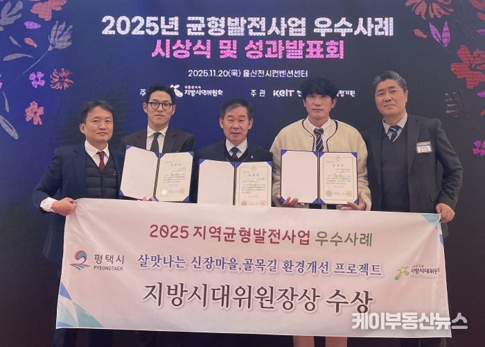 케이부동산뉴스 김교민 기자 | 평택시는 『2025년 균형발전사업 우수사례 시상식』의 균형발전사업평가 부문 우수기관으로 선정되어, 지난 20일 열린 ‘2025 지역균형발전사업 우수사례 시상식’에서 지방시대위원장상 기관 표창을 받았다.