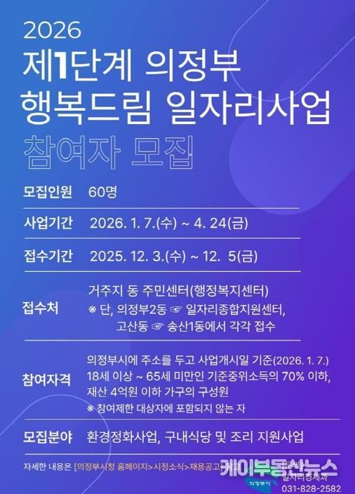 케이부동산뉴스 김교민 기자 | 의정부시는 12월 3일부터 5일까지 ‘2026년 제1단계 의정부 행복드림 일자리사업’ 참여자 60명을 모집한다.