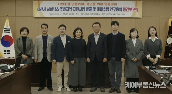 케이부동산뉴스 김교민 기자 | 이천시의회 의원연구단체인 ‘이천시 지역발전 연구회’는 27일 시의회 상임위원회실에서 『이천시 하이닉스 주변지역 지원사업 발굴 및 계획 수립 연구용역』 중간보고회를 개최했다.