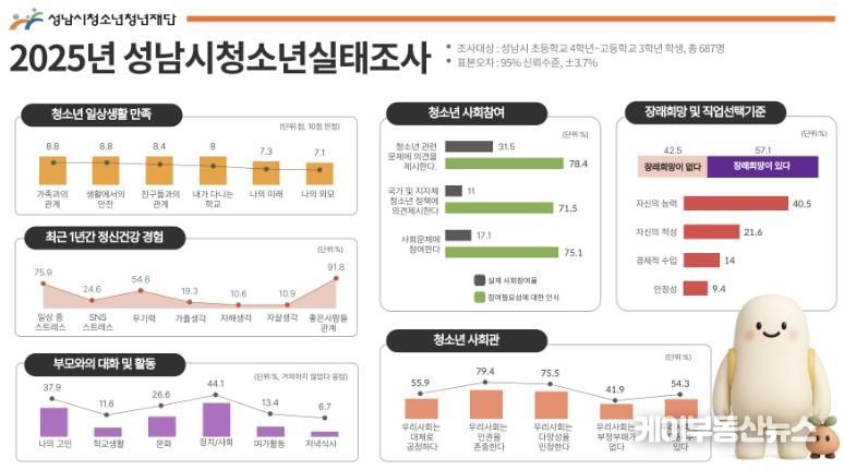 케이부동산뉴스 김교민 기자 | 성남시청소년청년재단은 관내 초등학교 4학년부터 고등학교 3학년까지의 총 687명을 대상으로 실시한‘2025년 성남시청소년실태조사’결과를 발표했다. 이번 조사는 성남시 청소년의 생활․정서․관계․사회참여 전반의 실태를 종합적으로 파악하기 위한 것으로, 표본오차는 ±3.7%이다.