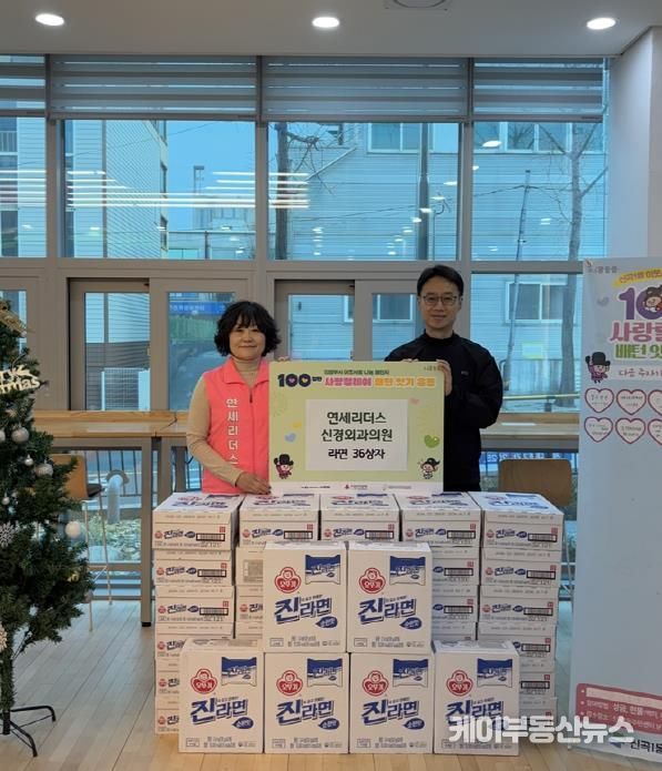 케이부동산뉴스 김교민 기자 | 의정부시 신곡1동주민센터는 11월 27일 연세리더스신경외과의원이 저소득 취약계층을 돕기 위해 라면 36상자를 기탁하며 ‘100일간 사랑릴레이 배턴 잇기’에 동참했다고 밝혔다.