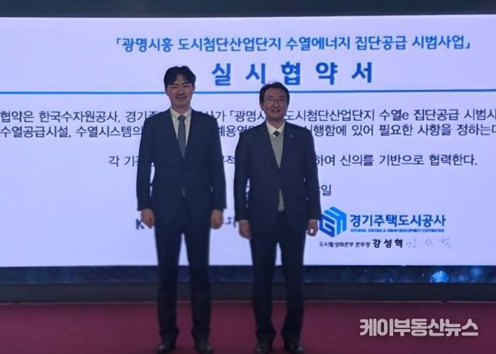 케이부동산뉴스 김교민 기자 | 경기주택도시공사(GH)는 3일 GH 수원 본사 9층 역량개발센터에서 한국수자원공사(K-water)와 함께 ‘광명시흥 도시첨단산업단지 수열에너지 집단공급 시범사업’ 추진을 위한 실시협약을 체결했다고 밝혔다. 이 자리에는 양 기관 관계자 약 30명이 참석했다.