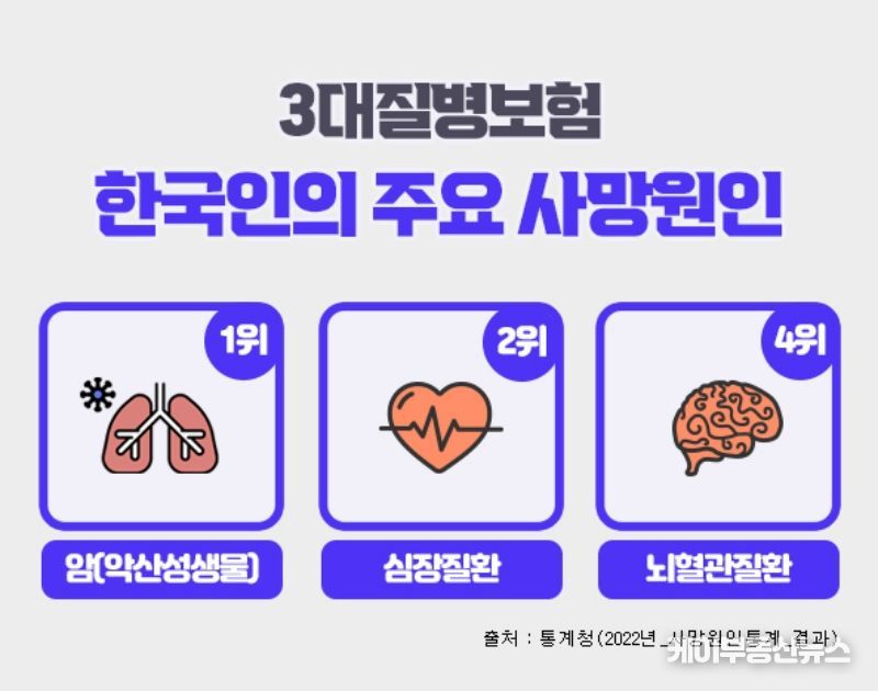 케이부동산뉴스 김교민 기자 | 흔히 3대질병이라 일컫는 암, 심혈관질환, 뇌혈관질환은 통계청 발표자료에 따르면 한국인의 주요 사망원인 중에서 3위 폐렴을 제외하고 1~4위를 차지하고 있으며, 이전부터 지금까지도 살면서 가장 먼저 대비해야 하는 치명적인 질병으로 강조되고 있다. 이러한 중대질병에 대비하기 위하여 상기 세가지 치명적인 질병을 집중보장하는 3대질병진단비보험을 많이 가입하고 있다. 3대진단비보험은 각각의 질병을 중점적으로 보장하면서도 가입자 특성에 맞는 특약을 추가함으로써 종합건강보험으로도 활용할 수가 있다.