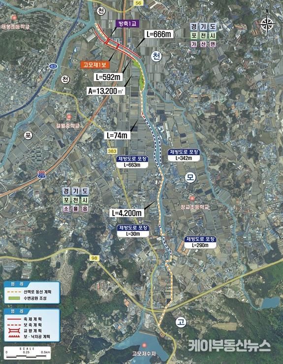 정비사업은 포천시 소흘읍 고모리에서 가산면 일원까지 총 연장 4.1km 구간을 대상으로 추진된다. 하천 제방 1.26km 보강을 통해 고모천의 홍수 대응 능력을 우선 개선하고 하천 유휴지를 활용하여 수변공원과 산책로를 조성해 주민들이 안전하게 이용할 수 있도록 하는 사업이다.