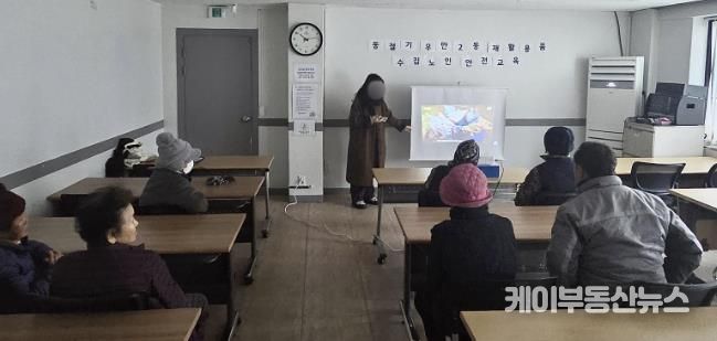 이번 교육은 재활용품 수집 과정에서 발생할 수 있는 교통사고 및 안전사고를 예방하고, 한파에 취약한 어르신들의 건강관리를 돕기 위해 마련됐으며, 안전 관련 동영상 시청을 통해 차도 통행에서 발생할 수 있는 사고 위험성을 안내하고, 재활용품 수집 시 유의 사항과 동절기 한파 대비 건강관리 요령을 중심으로 설명이 이루어졌다.