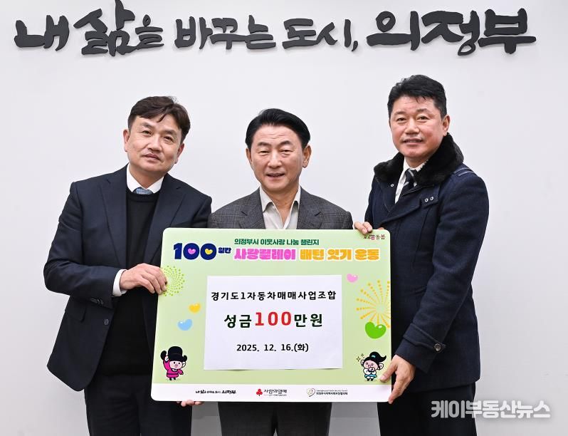 케이부동산뉴스 김교민 기자 | 의정부시는 12월 16일 경기도1자동차매매사업조합 의정부지부가 지역사회 나눔 문화 확산을 위한 ‘100일간 사랑릴레이 배턴 잇기’에 동참해 성금 100만 원을 기부했다고 밝혔다.