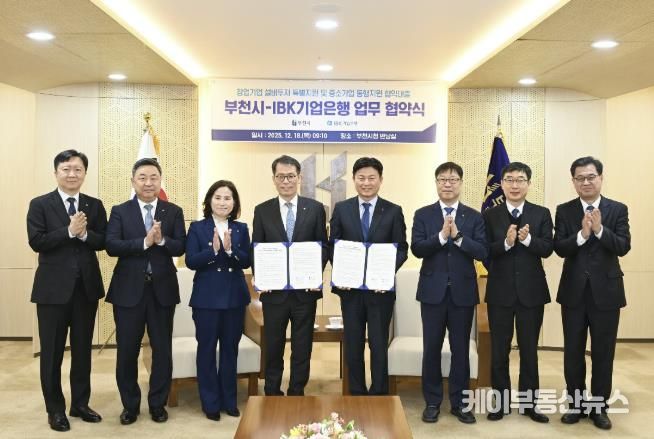 케이부동산뉴스 김교민 기자 | 부천시와 IBK기업은행이 12월 18일 ‘창업기업 설비투자 특별지원’ 및 ‘중소기업 동행지원 협약대출’ 업무협약을 체결했다. 협약식에는 조용익 부천시장과 김성태 IBK기업은행장을 비롯한 양 기관 관계자가 참석했다.
