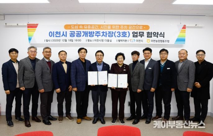 이천시는 12월 18일, 이천시장과 이천농업협동조합장이 참석한 가운데 공공개방주차장 조성 및 운영에 관한 협약식을 개최하고, 중리동 496-12번지 일원에 공공개방주차장을 조성하기로 했다.