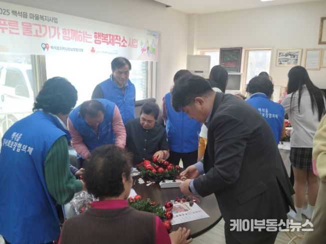 케이부동산뉴스 김교민 기자 | 양주시 백석읍 지역사회보장협의체가 지난 17일 연말을 맞아 백석읍 가업1리 경로당에서 ‘푸른 물고기가 함께하는 행복제작소’ 사업의 일환으로 크리스마스 리스와 무드등 만들기 활동을 진행했다.