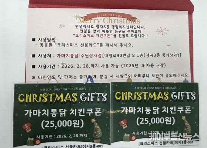 이번 나눔은 정자3동 주민자치 프로그램 강사가 이웃사랑 실천을 위해 기부한 성금 100만 원과 가마치통닭 수원정자점의 후원으로 마련됐으며 크리스마스를 앞두고 가족과 함께 따뜻한 시간을 보낼 수 있도록 치킨쿠폰을 준비하여 대상 가구에 배부됐다.