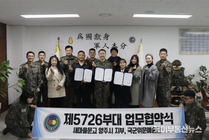 케이부동산뉴스 김교민 기자 | 새마을문고 양주시지부는 지난 12월 19일, 육군 제5726부대에서 군 장병들의 독서문화 확산과 인문학적 소양 증진을 위한 업무협약(MOU)을 체결했다고 밝혔다.