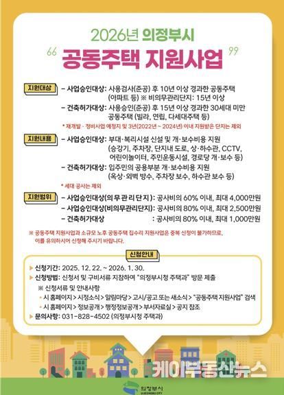 케이부동산뉴스 김교민 기자 | 의정부시는 노후 공동주택의 관리비용 부담 완화와 주거환경 개선을 위해 내년 1월 30일까지 ‘2026년 공동주택 지원사업’ 신청을 받는다.