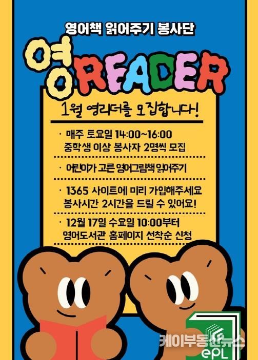 케이부동산뉴스 김교민 기자 | 의정부영어도서관은 2026년 1월부터 영어책 읽어주기 봉사단 ‘영리더’가 참여하는 재능기부 프로그램 ‘Please Read a Book’을 운영한다.
