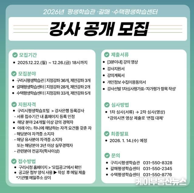 케이부동산뉴스 김교민 기자 | 구리시는 12월 26일 오후 6시까지 ‘2026년 구리시평생학습관·갈매평생학습센터·수택평생학습센터 평생교육 프로그램’을 함께 이끌어갈 역량 있는 강사를 공개 모집한다.